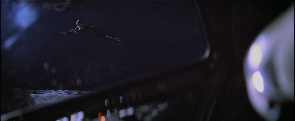 0:26:18 – 0:27:11 (Ursa confronts Andy) – Donner footage (0:43). In this sequence, the wires holding the astronaut are clearly visible in the shot. According to the Tom Mankiewicz script from 1977, the astronaut is named Robbie, not Andy.