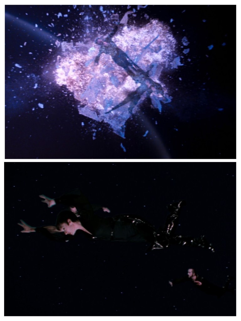 The bomb explodes, ripping a hole in outer space and hurtling Superman back to Earth.
