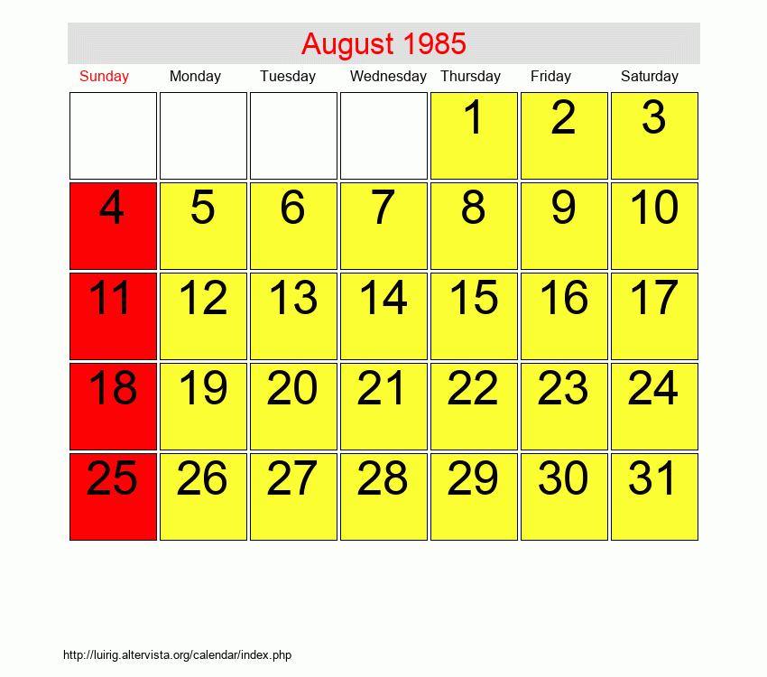 This is confirmed by the actual August 1985 calendar from back in the day.