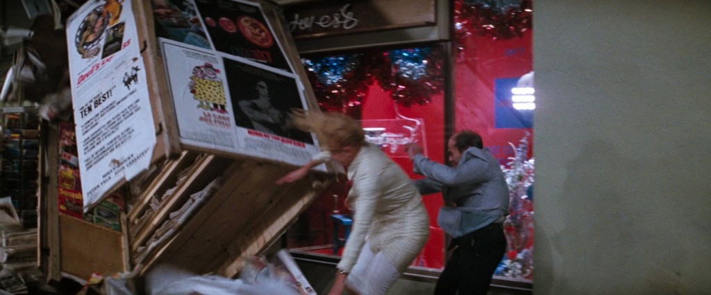 Now let’s turn our attention to some more movie posters that can be found in Superman II. During the battle in Metropolis, the villains use their super breath to literally blow a path through everything and everyone, even the hair off one couple’s heads. As they run into a newspaper stand, the stand collapses, and we can see several more movie posters on the sides of the stand. Some of these are easily visible, while others are a little harder to determine.